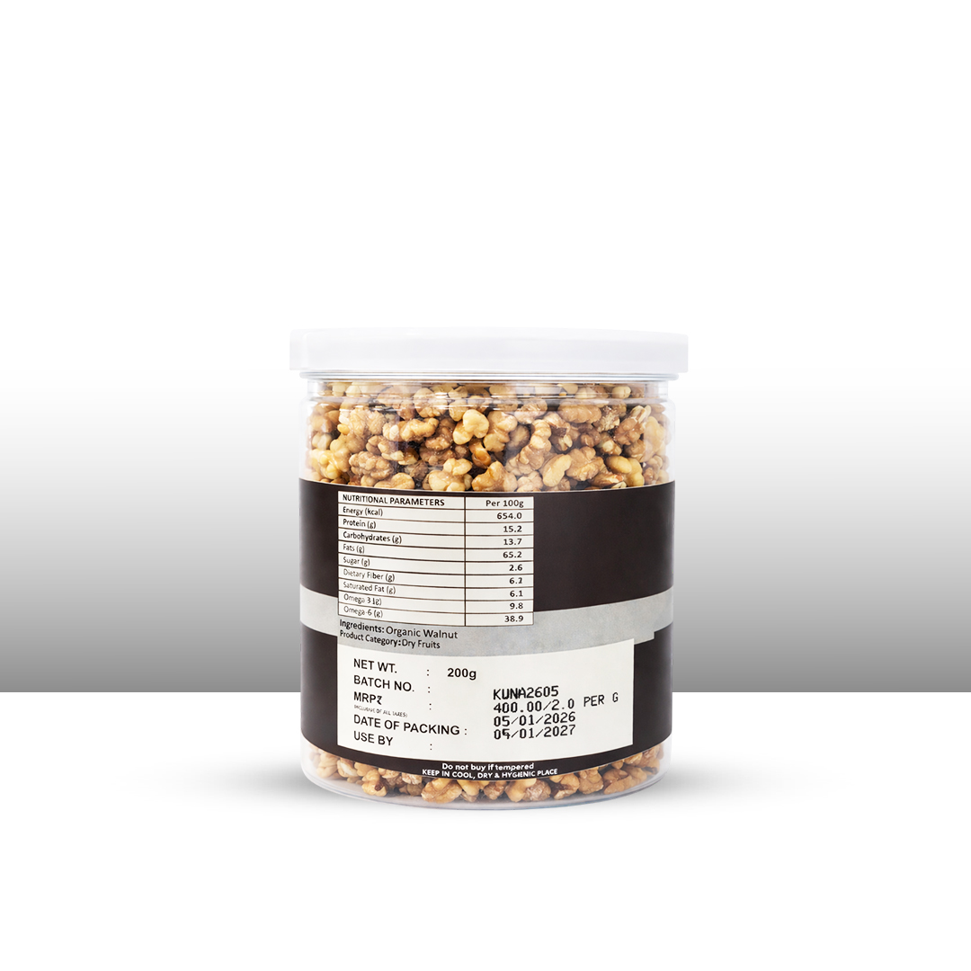 Procured from the land of Jammu Kashmir, NIMBARK Organic Walnuts are one of the excellent sources of plant-based omega-3 & omega-6. These alpha-linolenic acid-rich dried fruits are commonly eaten as raw, roasted, and also included in various dishes as an important ingredient. Research also says that consuming these Kashmiri Organic Walnuts(kernels) will provide you a good amount of healthy fats, like monounsaturated and polyunsaturated fats (PUFAs). TheseunshelledOrganic Walnuts from NIMBARK are also a prominent source of vegan essential fatty acids.